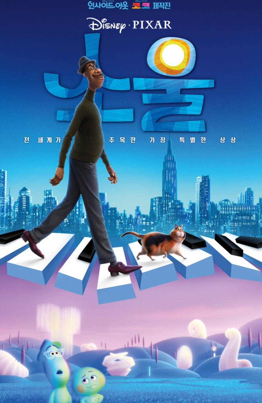 픽사 애니메이션 장편영화를 보며 태어나기 전의 세상의 영혼들을 지루하지 않게 잘 묘사한 것 같아 좋았습니다. 음악이 전부였던 조에게 뜻하지 않는 사고로 태어나기 전의 세상에 가보기도 하고 다시 지구로 내려가기 위해 멘토를 만나 준비해야 할 조건들을 보면서 조는 그동안 살아왔던 삶을 돌아보며 무의미하게 삶을 살아온 자신을 보며 후회를 하게 됩니다. 코로나로 인해 삶에 많은 변화가 있습니다. 영화 소울을 보며 태어나기 전의 나는 어땠는지는 잘 알 수 없지만 소울 영화를 보며 삶에 태도에 다시 생각해 보는 좋은 시간이 되었습니다.