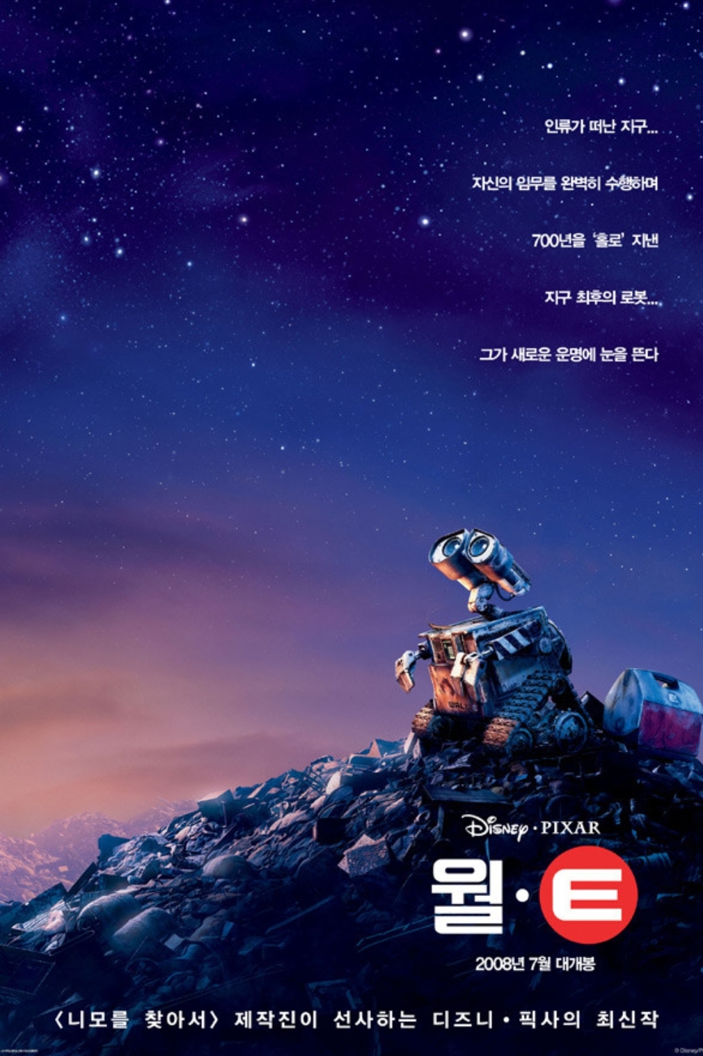 픽사의 애니메이션 장편영화 월. E는 지구에 홀로 남겨져 쓰레기 더미에 파묻힌 지구에 남겨진 청소로봇입니다. 수백 년이란 시간을 외롭게 일만 하면서 보내던 월. E 그런데 그가 식물 탐색하기 위해서 지구에 온 매력적인 탐사로봇 이브에 대한 사랑의 마음 생깁니다.잡동사니 수집만 하던 월. E는 인생에 소중한 목표가 생겼습니다. 매력적인 이브는 지구의 미래를 결정하는 중요한 열쇠가 우연히 월. E에게 들어간 사실을 알게 되는데 인간들에게 이를 보고하기 위해서 서둘러서 우주로 향하고 인간들은 언제나 고향별로 돌아갈 수 있는 날만 애타게 기다립니다. 월. E는 은하를 가로지르게 되는데앞에 가던 이브를 뒤쫓아 갑니다. 미래 세계를 배경으로 넓은 우주에서 펼쳐지는 월. E의 환상적인 모험으로 용감하지 않은 사회 부적응 로봇들과 애완용 바퀴벌레까지 재미있고 유쾌한 캐리턱들이 여기에 동참하게 됩니다. 앤드류 스탠튼 감독은 영화 니모를 찾아서 토이스토리 업 등 다양한 작품을 작업한 감독입니다. 픽사 애니메이션 월. E 영화가 일본에서는 영화 월. E 애니메이션이 쿵푸 판다의 3배가 넘는 흥행 기록을 세웠습니다. 고베 작품상 부문에서는 일본 애니메이션을 제치고 선정될 정도였는데요 고베 작품상이 폐지가 되긴 했지만 영화 월. E가 둘도 없는 일본 외 국가의 명작품으로 남게 되었습니다.